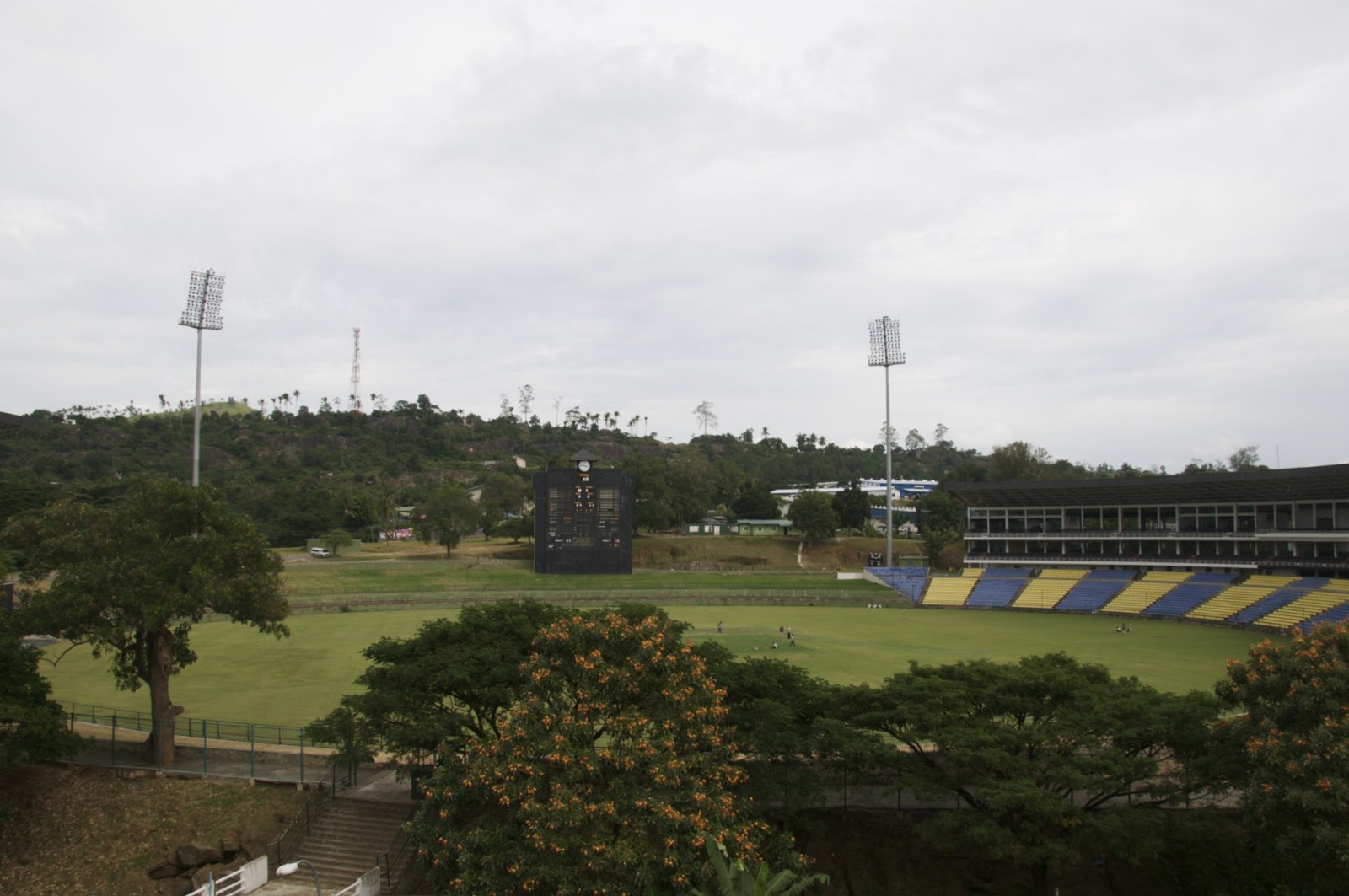 Ranjan then takes us on a drive through Kandy and past our hotel. Ian wants to go for a walk around the lake, but we keep driving. Soon we are outside the Kandy cricket ground. Trying to take some photo’s we are beckoned into someone’s house. Well it is actually a building site. It looks at one time like it was a hotel or is going to be a hotel. Not sure if being built or repaired. We go up these concrete stairs, 2 men who do not speak a word of English keep beckoning us to follow. Ranjan assures us it is OK. We are at this stage still not sure about Ranjan. We get to the top & have a magnificent view of the ground. The toothless man grins, brings out an “England Flag” (actually New Zealand) and points at broken seats, more grins. Ranjan translates English people come here & drink beer to watch the cricket. His flag mistake is pointed out & he disappears again only to return with a real England flag, more toothless grins. We wish them all Ayubowan (long life) and head back to the car. They are still waving as we get down to the end of the road. It is situations like this that you do not know what to do, do you offer them some money, and will they be offended. We do feel uneasy, but it would be very bad to offend someone’s hospitality.